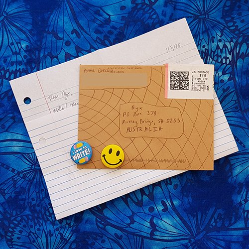 Given I hadn’t yet replied (it’s now in the mail!) to the last letter from Anna, this one was very much a surprise. A lovely little note and some fun buttons for my collection! These both remind me of my high school days. I was all about smiley faces and writing back then. I love the nostalgia. Thanks so much, Anna!