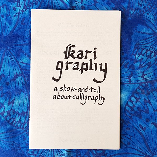 Kari-graphy – A Show-and-Tell About Calligraphy is a ½ fold black and white zine about calligraphy.