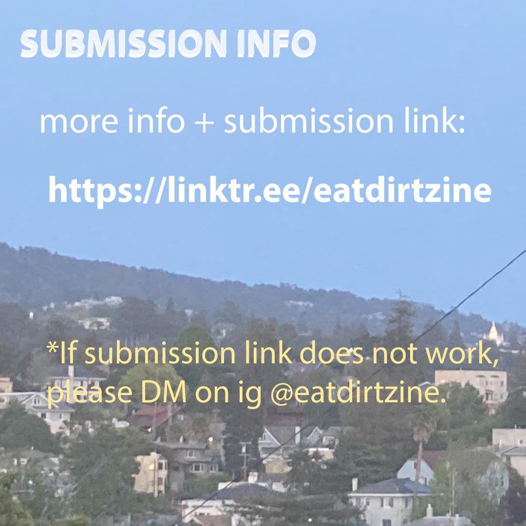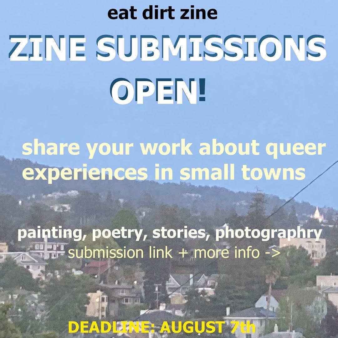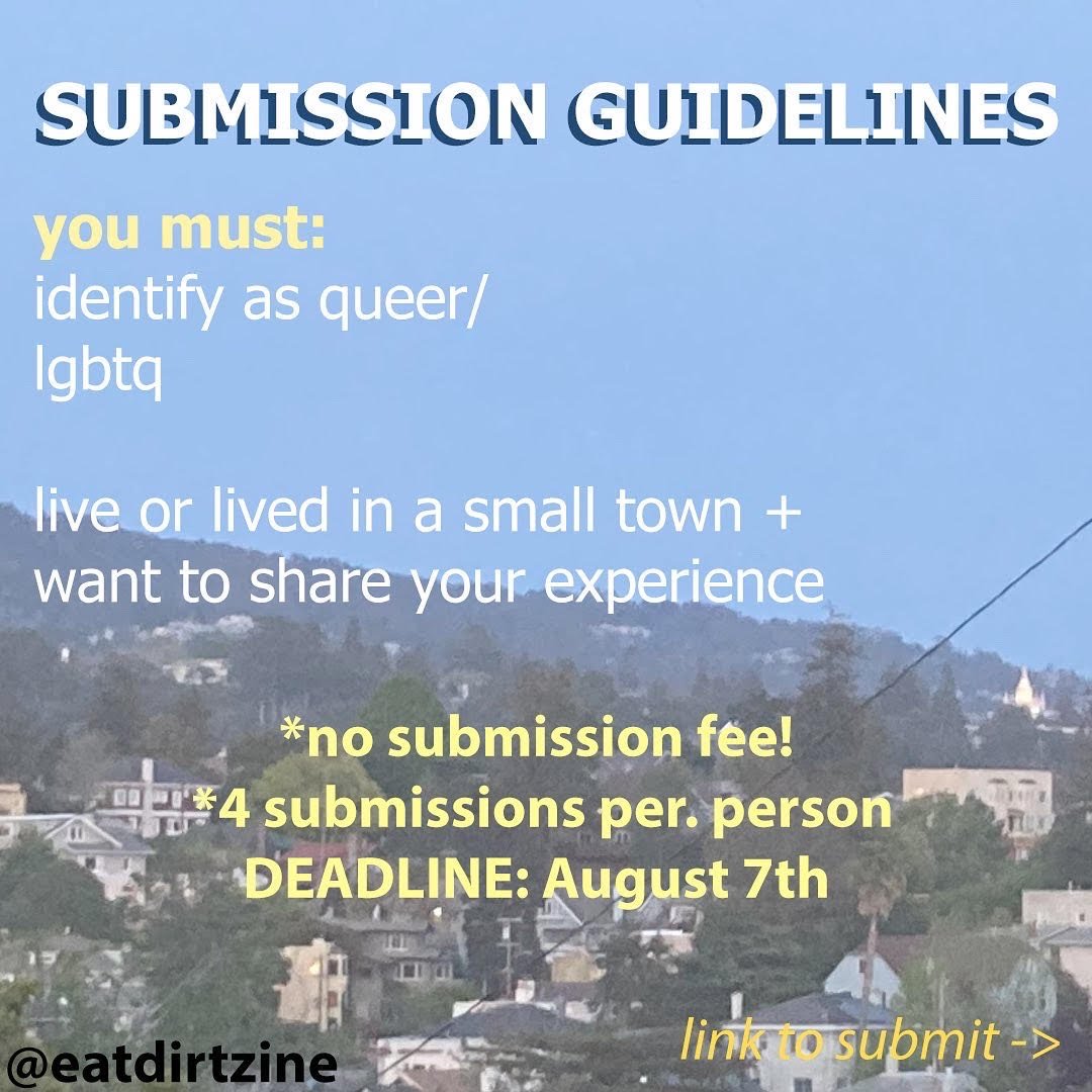 Posted on July 2, 2022 by NyxCall for Submissions: Eat Dirt Zine 2022: Queer Experiences in Small Towns If you have any questions, DM @eatdirtzine on IG https://linktr.ee/eatdirtzine