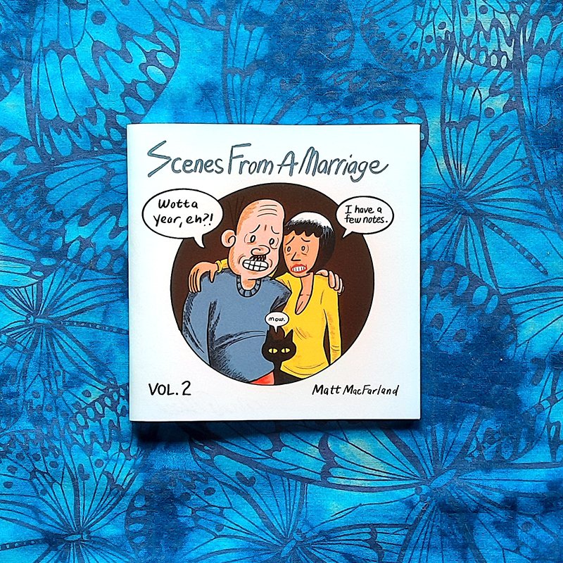 Scenes From A Marriage Vol 2 is a 5 inch x 5 inch (~12.5cm x 12.5cm) partially black and white, partially colour comic zine about, well, marriage life. The zine is filled with comics that are one or two pages long, with each page featuring four panels per page.