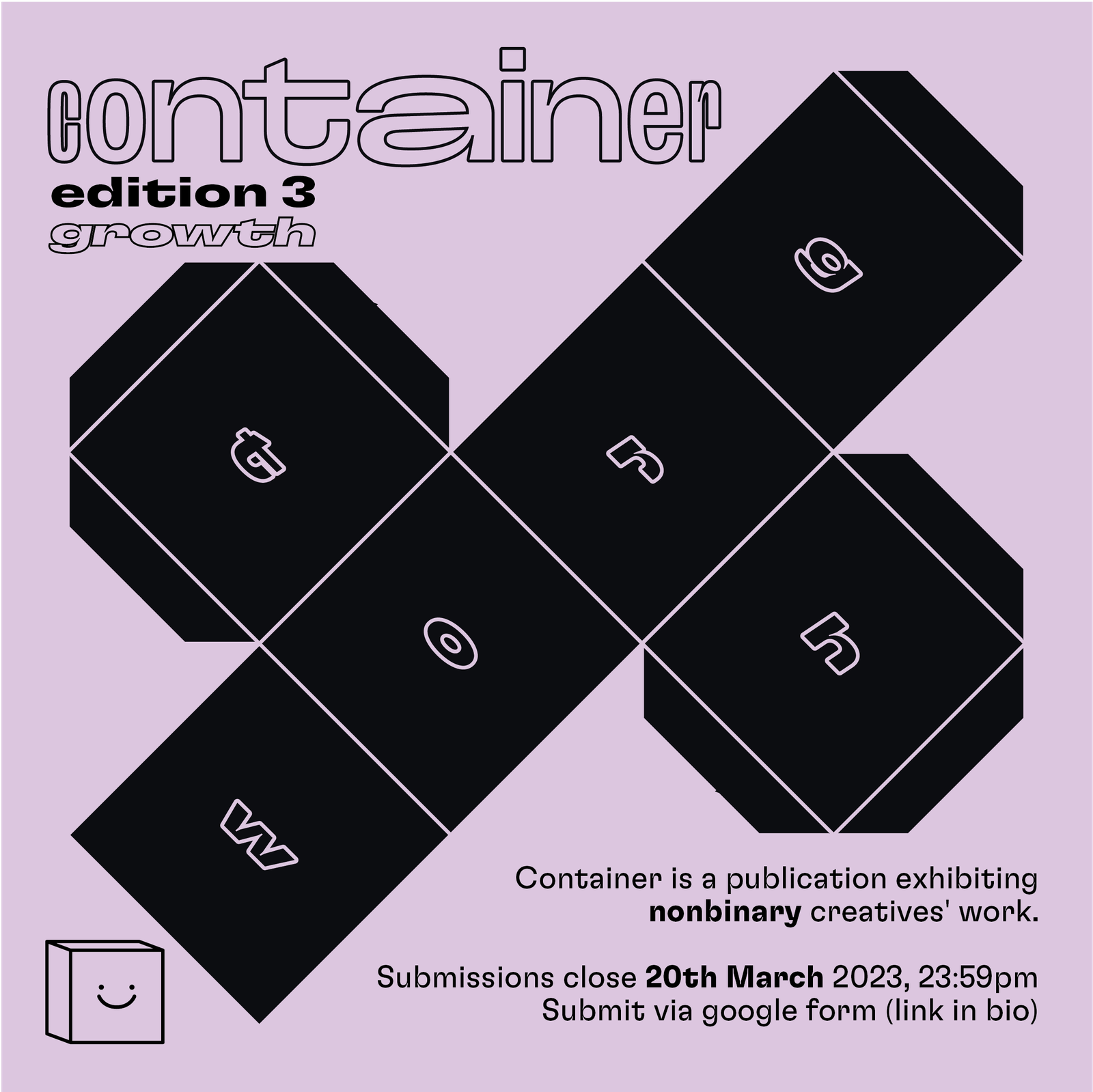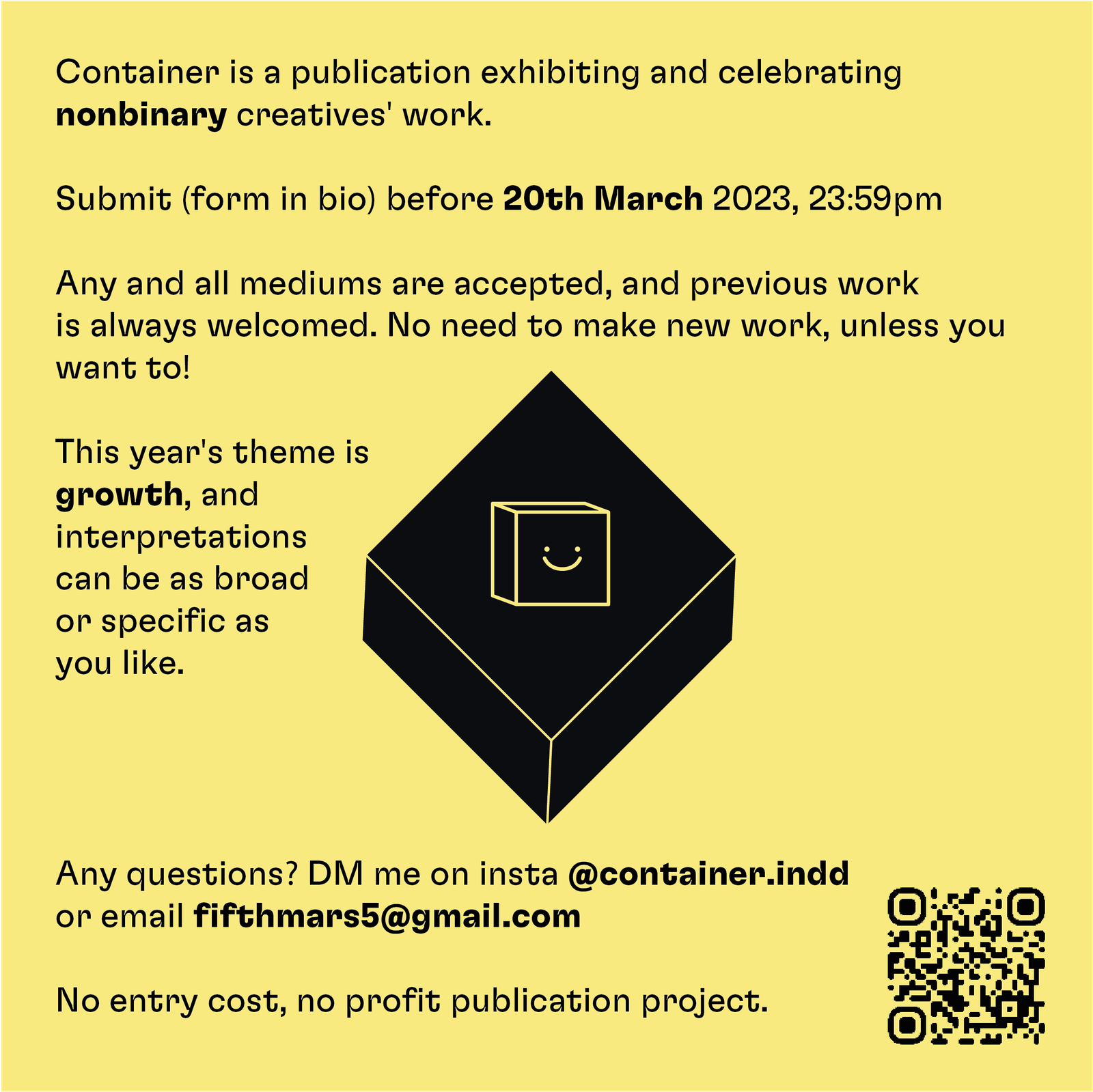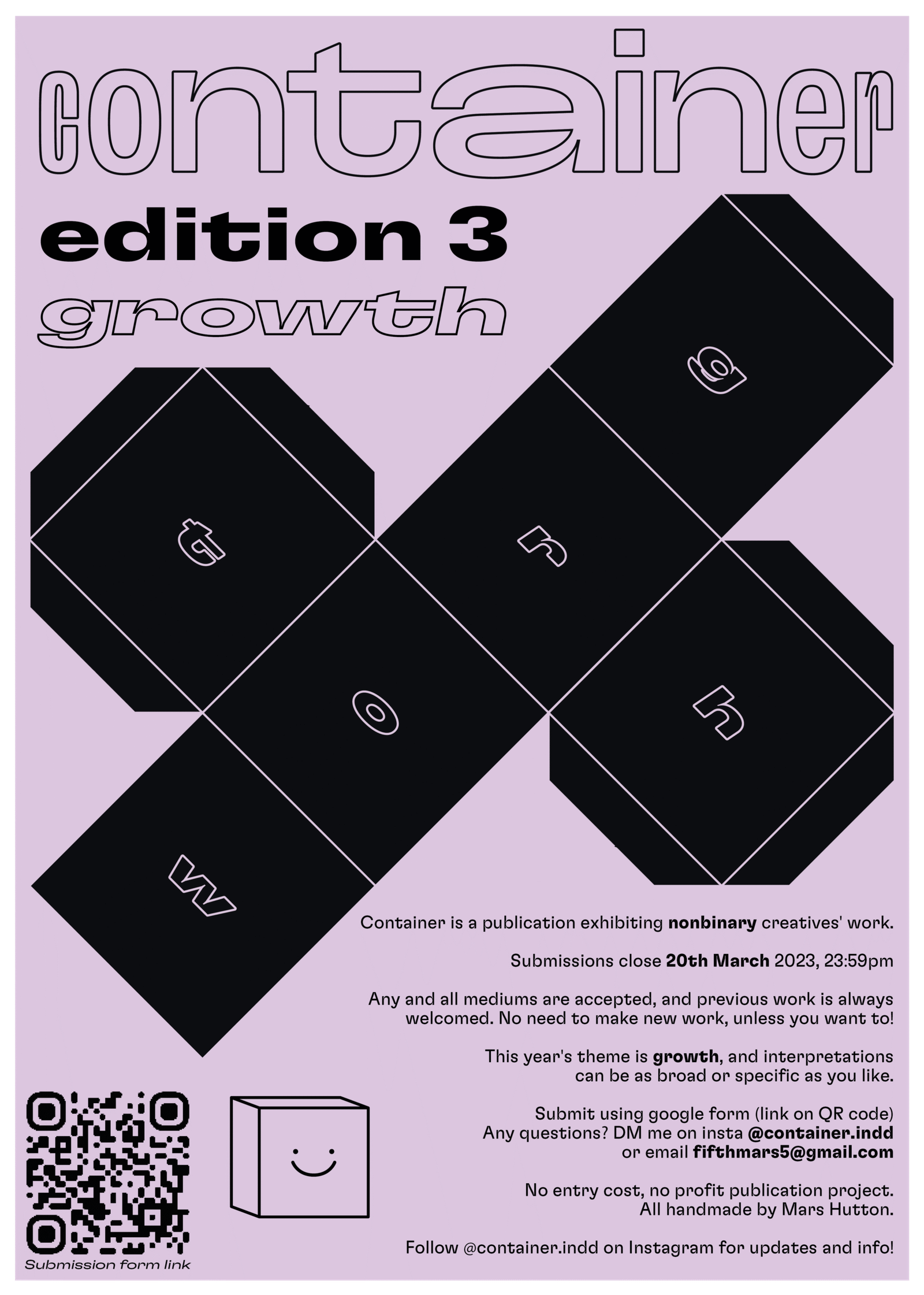 Container is an annual publication celebrating the work of nonbinary creatives. This year’s theme is “growth”, and I would love to see any and all work you have! Past editions of Container have explored fluidity and joy, and have had a range of submissions, from textile art to music to tattoo flash and more.