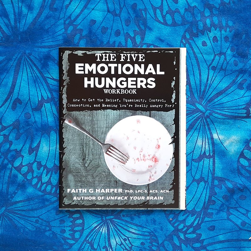 The Five Emotional Hungers Workbook is a US quarter-sized, black and white workbook format zine about emotional hungers that can trigger or push emotional eating and questions to ask yourself to examine your emotional eating.