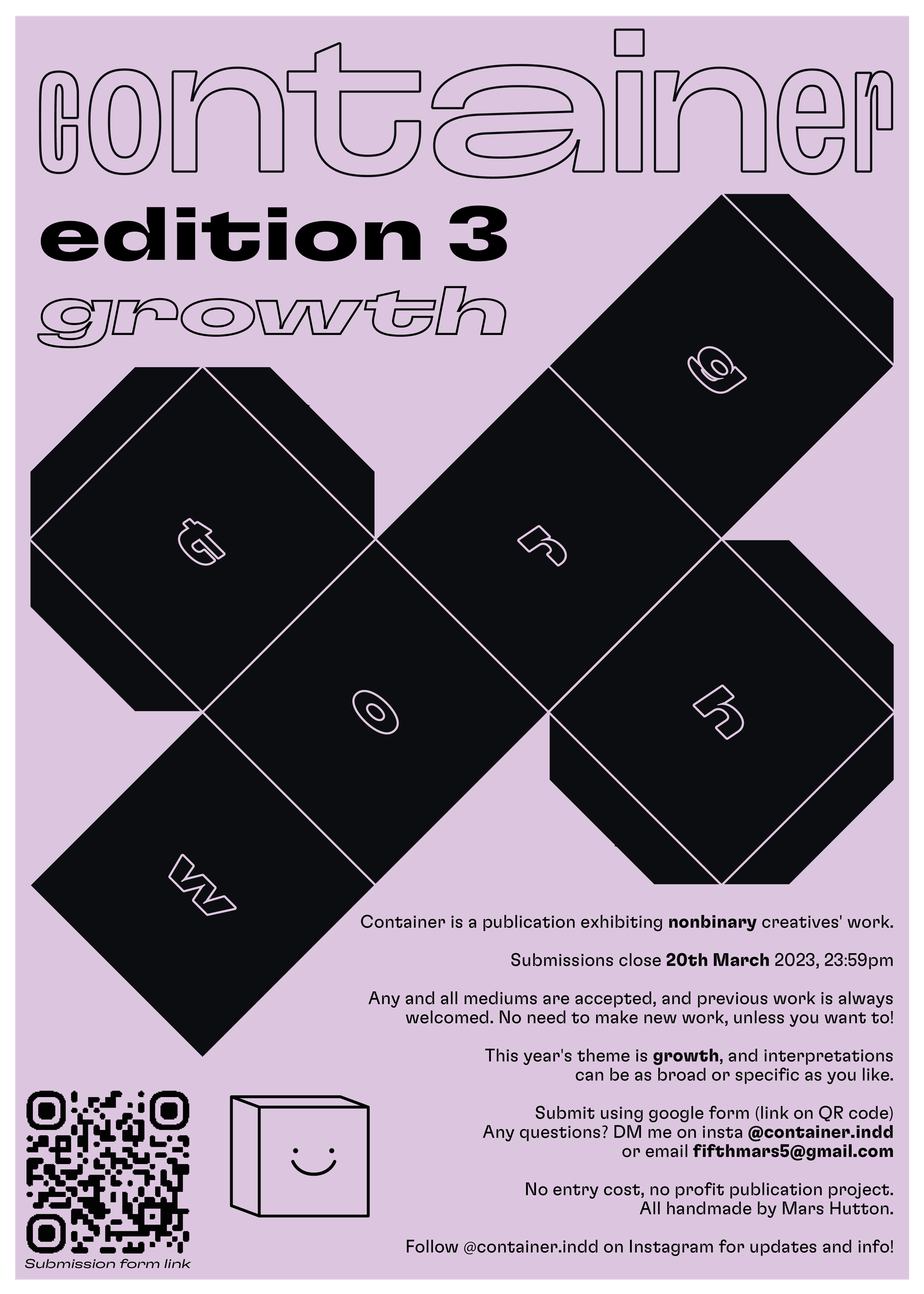 Container is an annual publication celebrating the work of nonbinary creatives. This year’s theme is “growth”, and I would love to see any and all work you have! Past editions of Container have explored fluidity and joy, and have had a range of submissions, from textile art to music to tattoo flash and more.