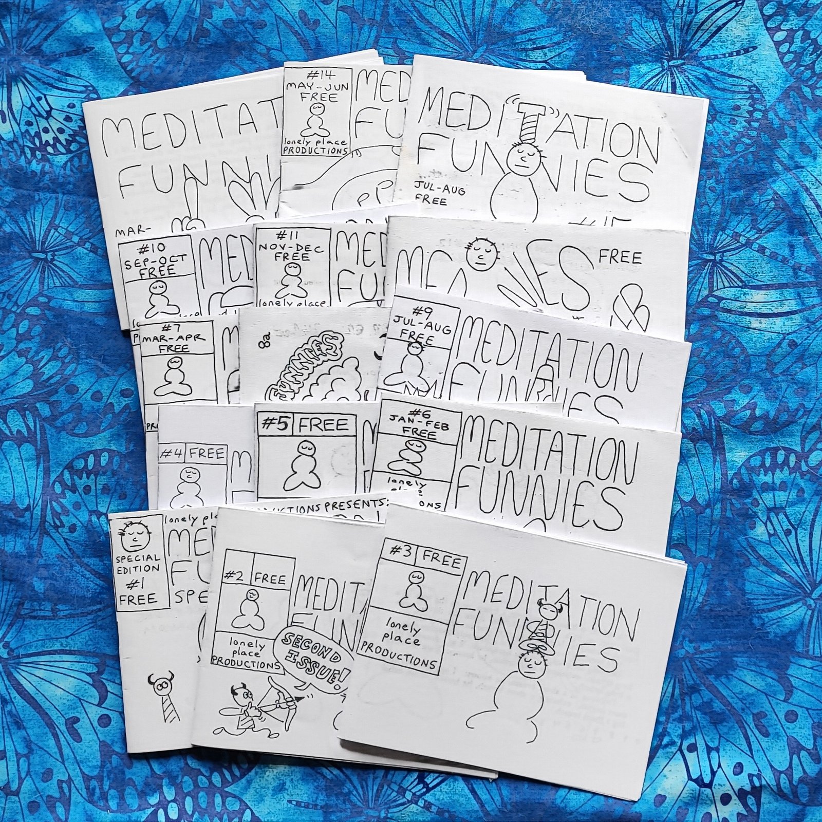 Meditation Funnies is a series of ~10.8cm x 14cm black and white comics exploring Buddhist concepts and meditation as well as day-to-day thoughts primarily in the form of the meditator and their thought demon.