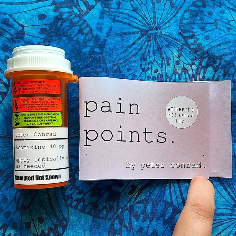 Attempted Not Known 12 – Pain Points. is a 7.8cm x 12.2 cm black and white comic featuring comics about physically painful accidents that happened in Peter’s life – with the entire zine curled up in a standard US pill bottle.